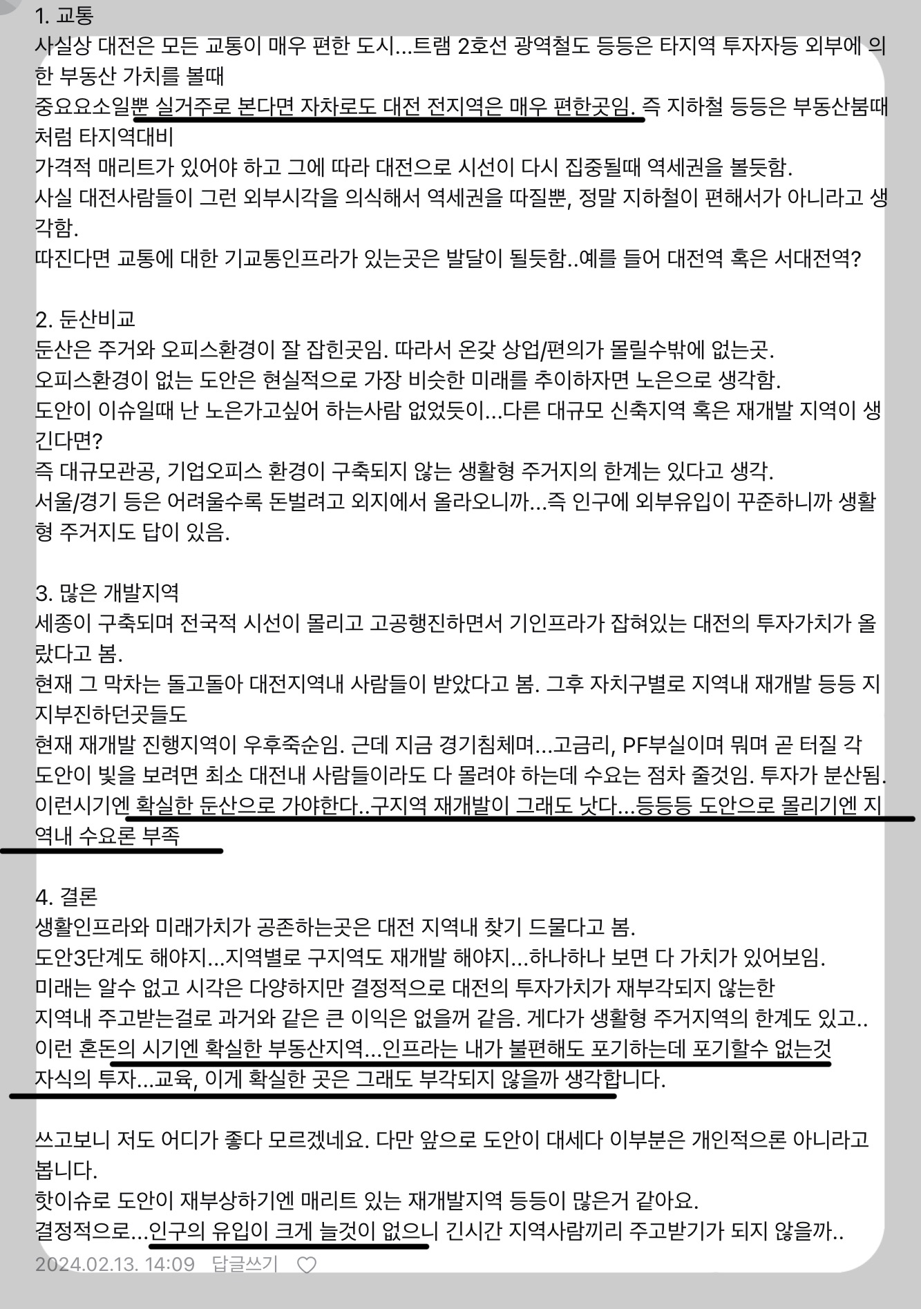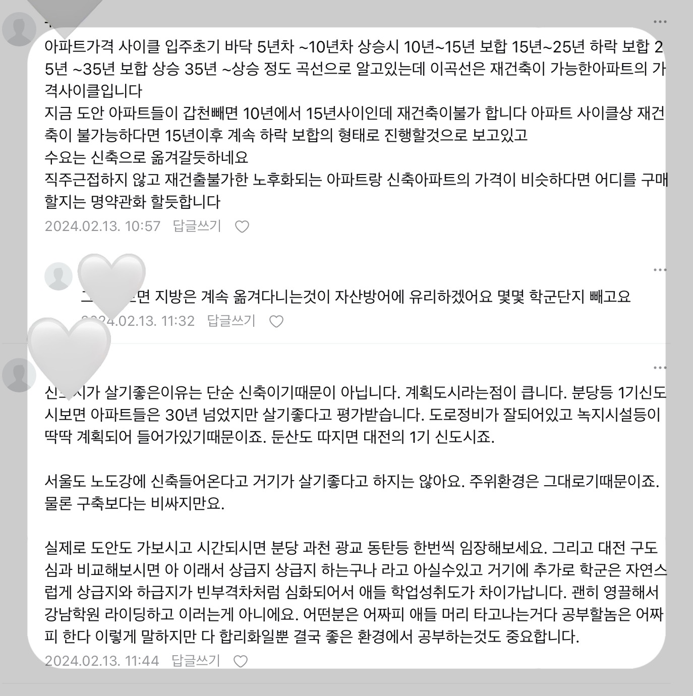 두 번째 댓글 쓴 분은 구축인지 신축인지 중요한 게 아니라 주변 입지가 중요하다. 도안동은 그런 의미에서 상급지이다라는 의견이었다. 신도시이기 때문에 도시계획이 잘 되어있다는 점을 짚었다.