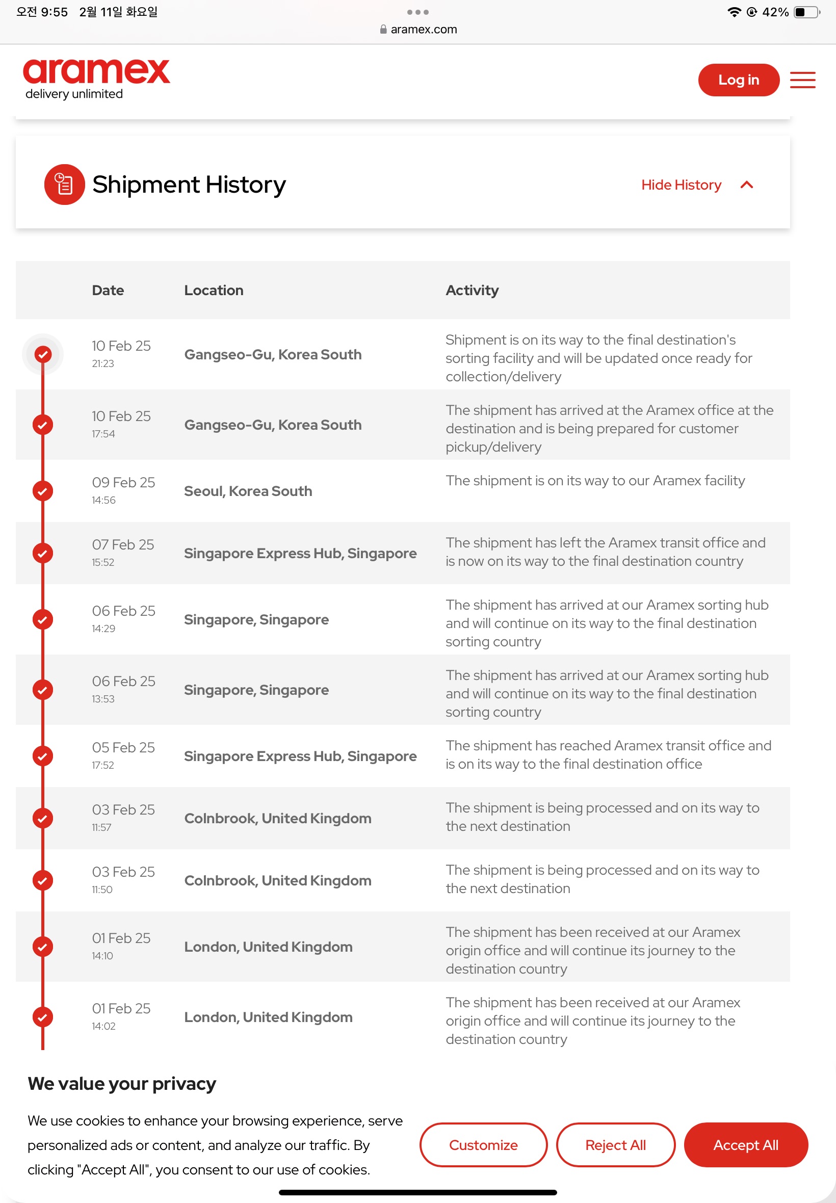 영국에서 싱가폴 거쳐서 서울로 들어와있고