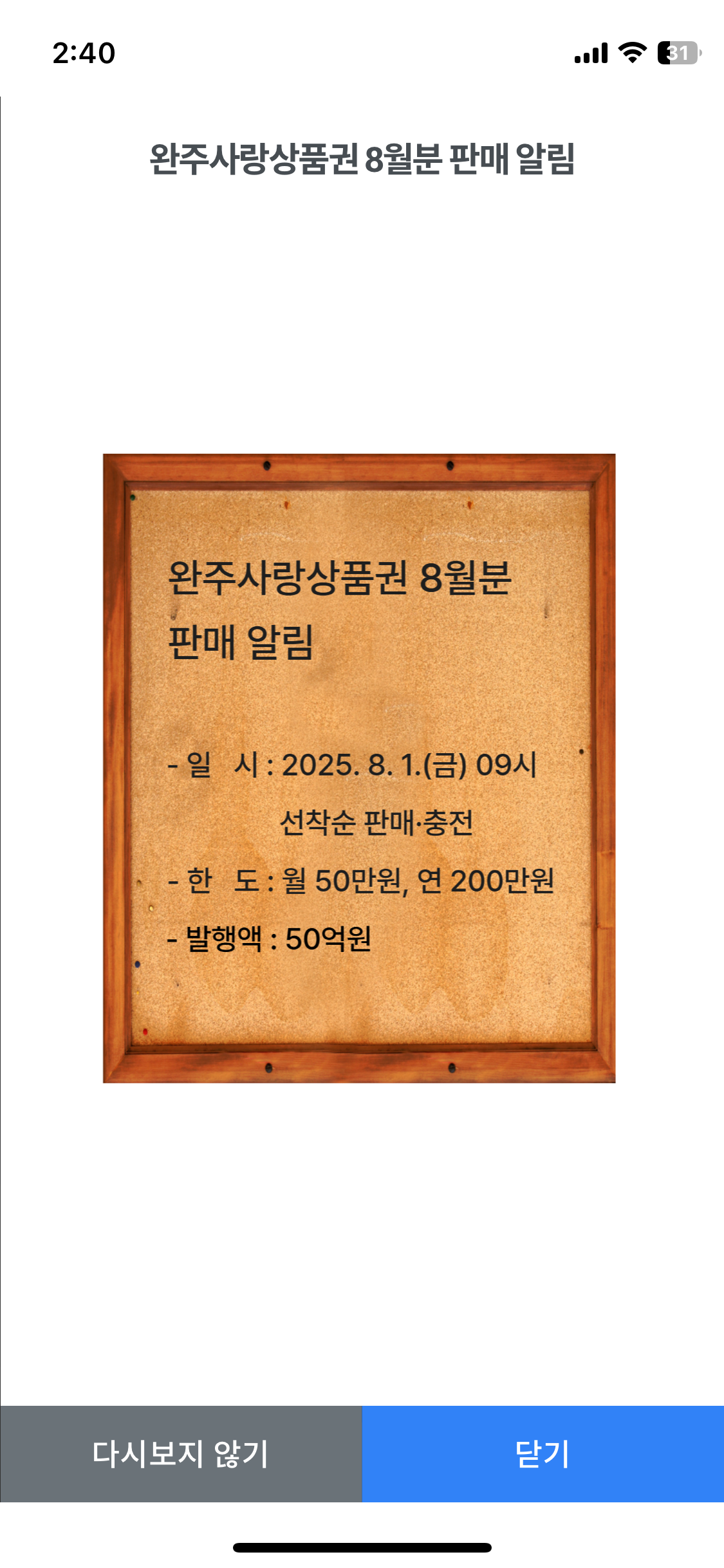 원래 9시 정각에 하지않으면 계속 실패했던 완주사랑상품권이 이번달에는 오후 2시 40분정도 까지 충전가능했다. 다들 소비쿠폰 쓰느라 충전을 안한듯 하다.