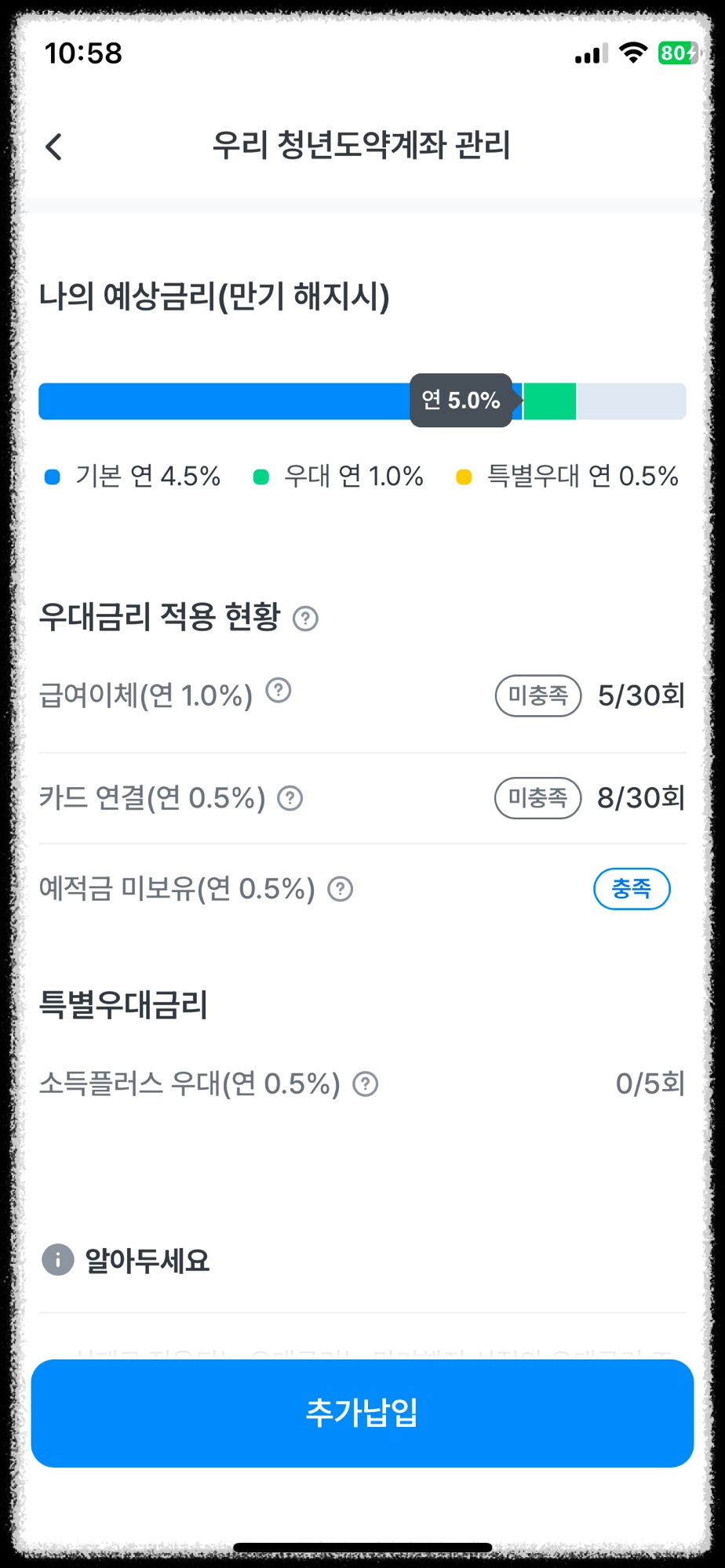 앞으로 급여이체 실적이나 우리 카드 사용 횟수를 채우면 추가 금리를 더 받을 수 있어요.