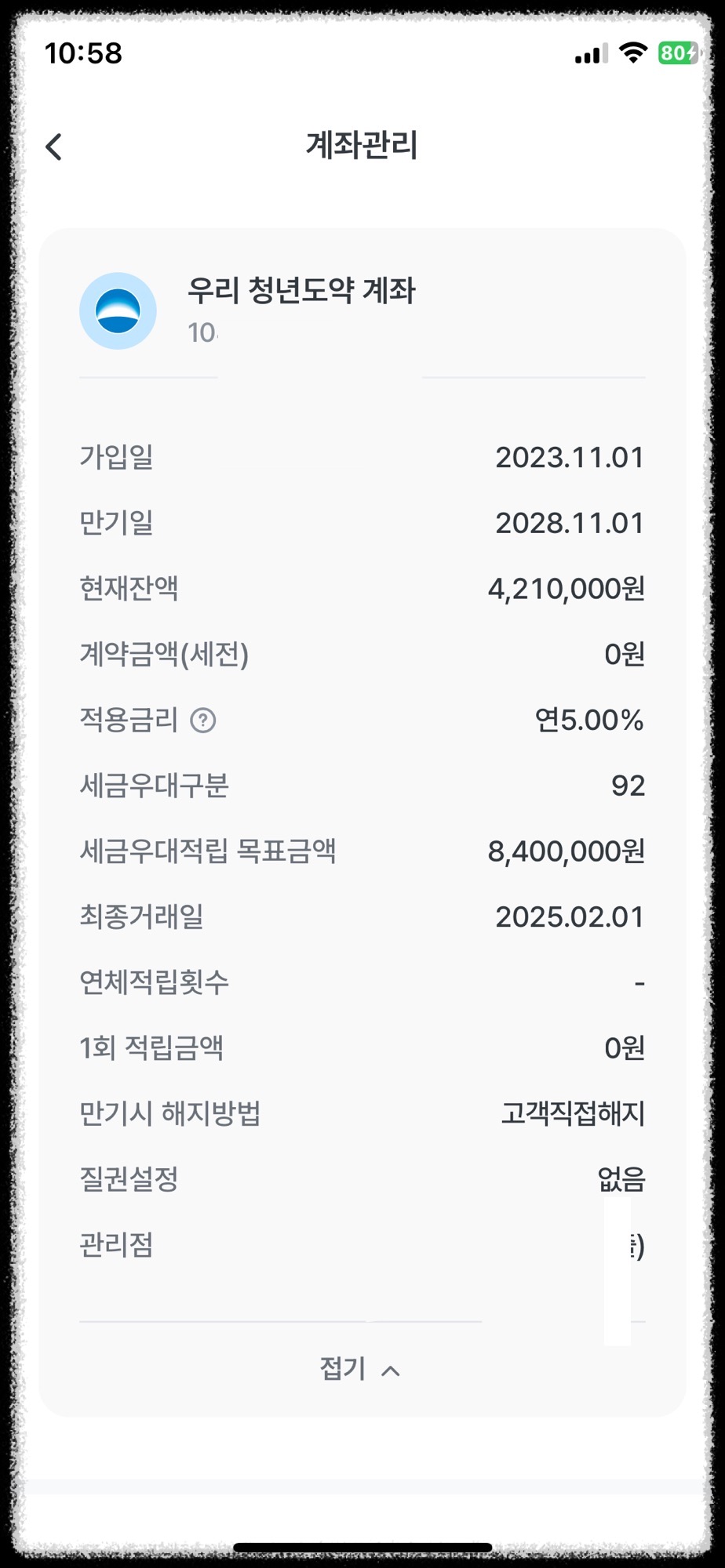 저는 만기일이 28.11.01이라 현재 25년 2월 기준 앞으로 44회 더 납입할 예정이에요.