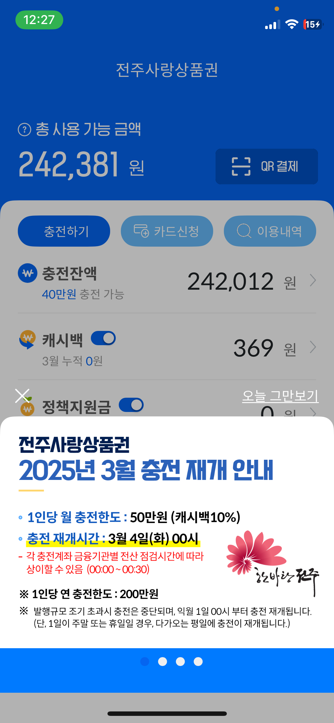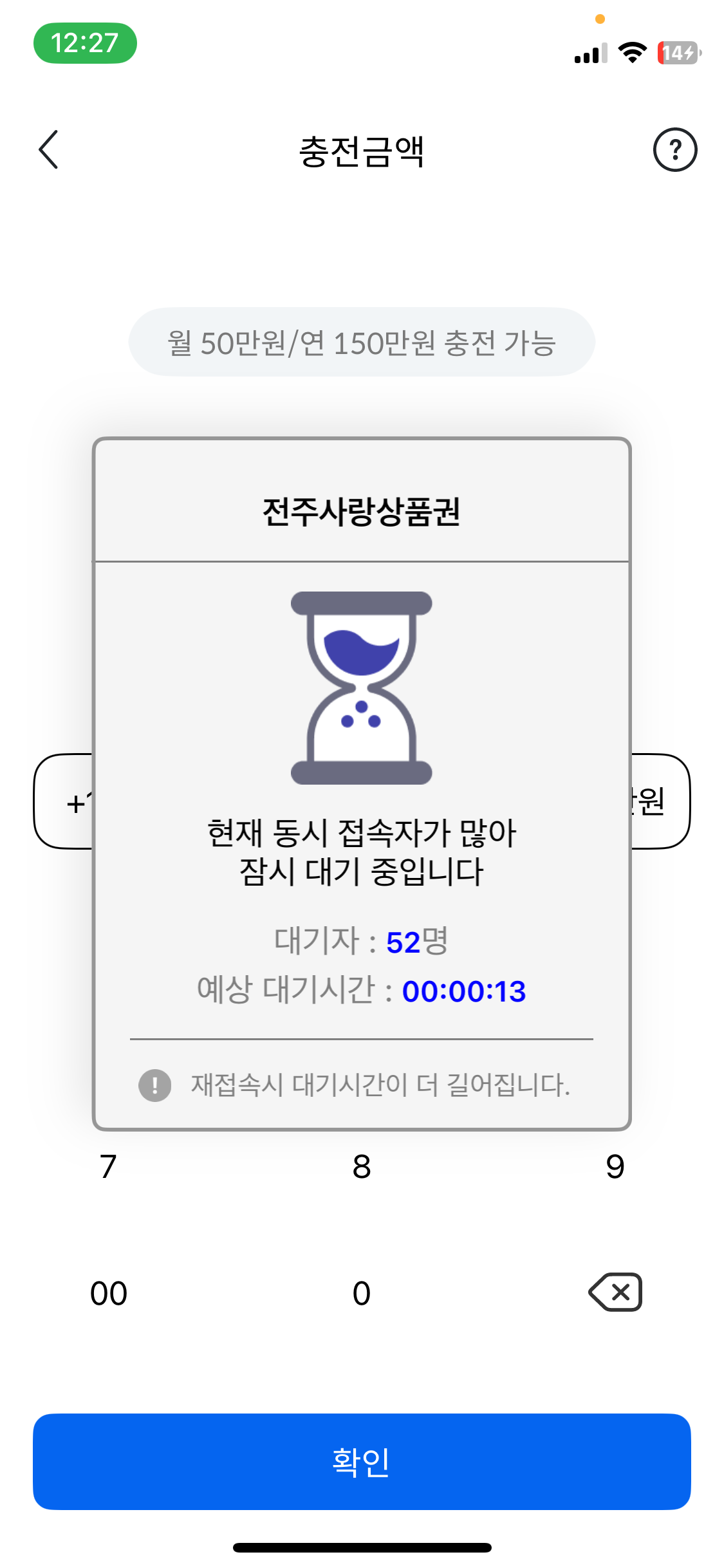 12시 30분쯤 시도했을 때 앞에 대기자 52명있고 예상 대기시간 00:00:13초 정도 기다리니 바로 충전 가능했어요. 완주사랑상품권보다 훨씬 체감 경쟁이 적은 것 같아요. 완주사랑상품권은 정각에 잊지않고 바로 해야하는데 전주는 널널한 느낌인 것 같아요!