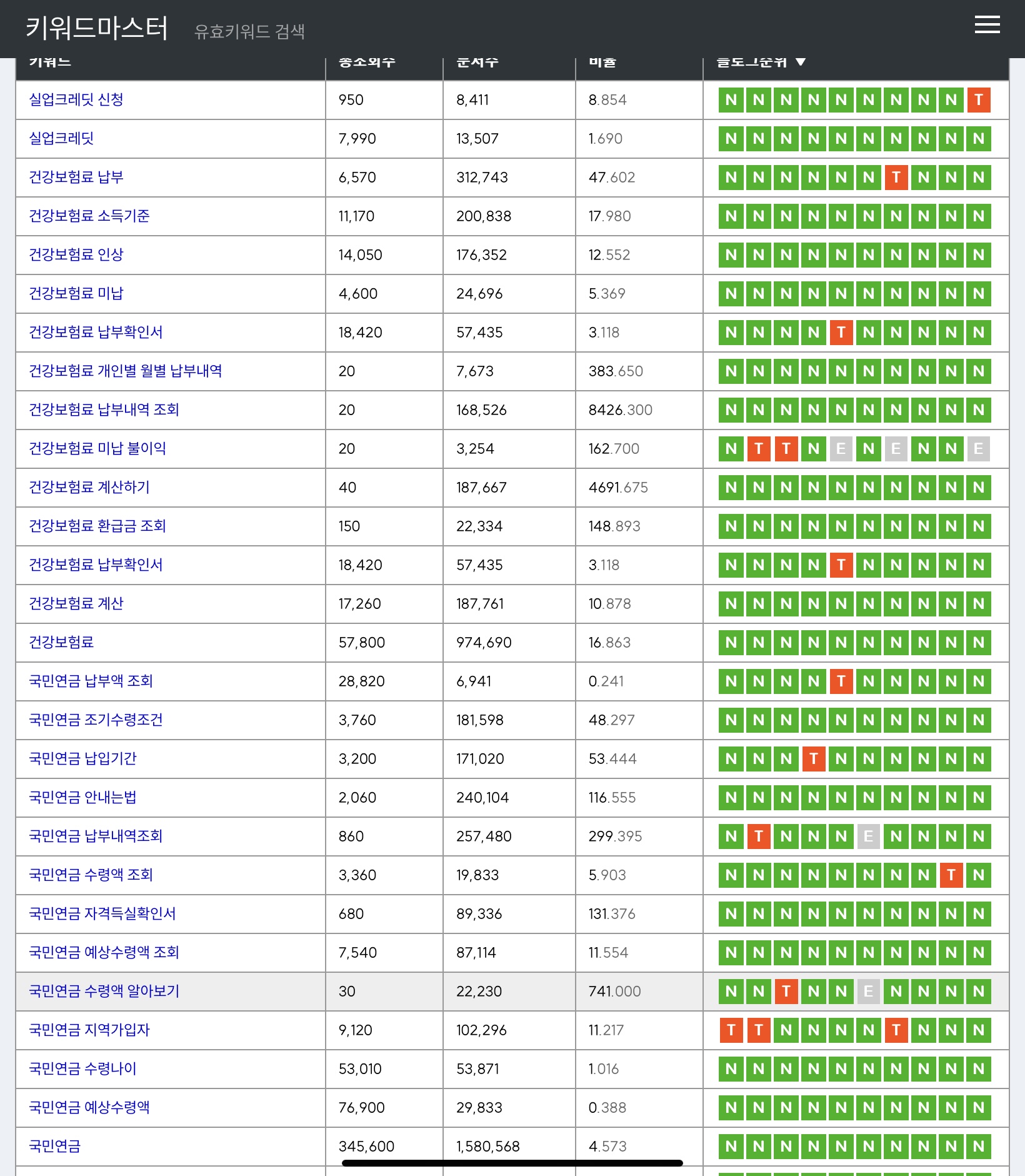 국민연금, 건강보험, 실업크레딧과 관련된 키워드들 검색량 대비 문서수가 이미 많은 편이긴 하다.
