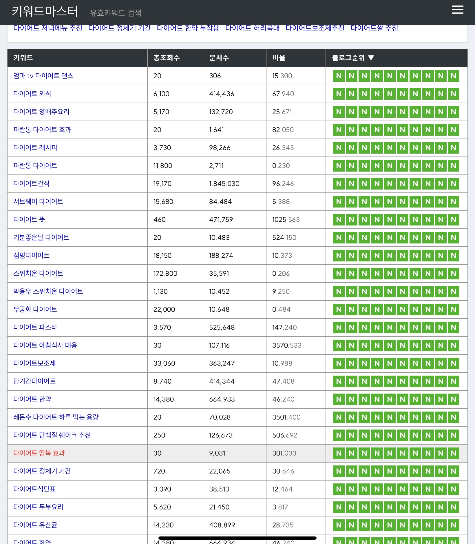 '다이어트 간식', '점핑 다이어트' 등 광고 문서들이 많을 만한 키워드는 역시 문서수가 훨씬 많았다.